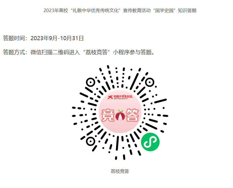 (一)“国学史园”知识竞答。组织干部师生围绕习近平新时代中国特色社会主义思想、中华优秀传统文化传承与发展,学习国学知识、探寻文化历史、掌握发展脉络,开展形式多样的国学知识学习与校史文化教育,增强广大师生的文化自信,激发山医学子的爱国爱校情怀,坚定山医学子强党报国志向。鼓励有兴趣学生踊跃参加“国学史园”知识竞答,具体参与方式为:登录中国大学生在线网站(https://dxs.moe.gov.cn/zx/)“活动”栏目下“活动公告”中“2023年国学史园知识答题”板块中参与答题,每位参与者只能参与一次。