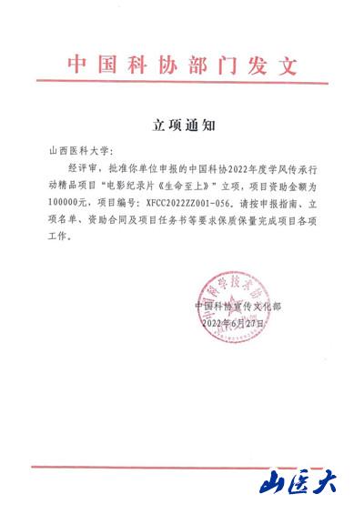我校电影纪录片《生命至上》项目获中国科协2022年度学风传承行动精品项目立项
