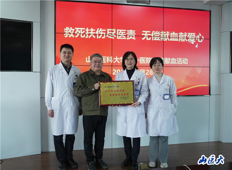 活动现场,太原市血液中心主任周源授予第一医院“妙手仁心除病痛,捐献热血显真情”牌匾。贾红燕说:“无偿献血是医务工作者用实际行动践行医者仁心的另一种方式,当前全国范围内血液资源非常紧张,我们的每一次献血都是在为生命续航,为社会公益事业贡献力量。”